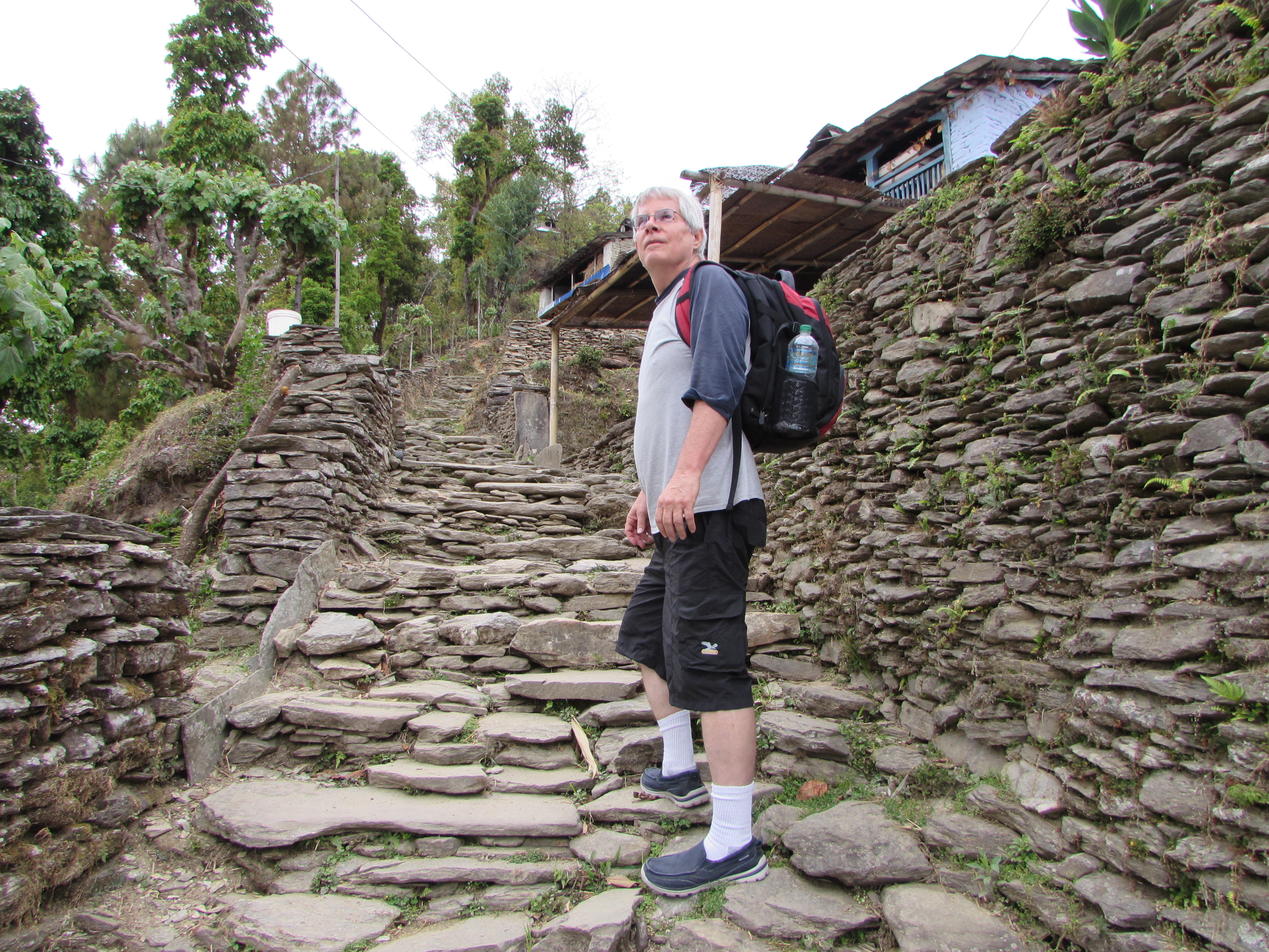 I had muesli for breakfast, then off we went on a shortcut Luxman, my guide, had discovered that led us past several mountain huts, along a goat path maybe a foot wide – I had to watch each step for a misstep would be costly – on to the hilltop village of Sarangkot, only 5 to 6 hours away (depending on how many times Ray needed to stop). However this pathway was reasonably flat along the summit of several hills, and not only did I not tire, but I got to enjoy the great scenery.
