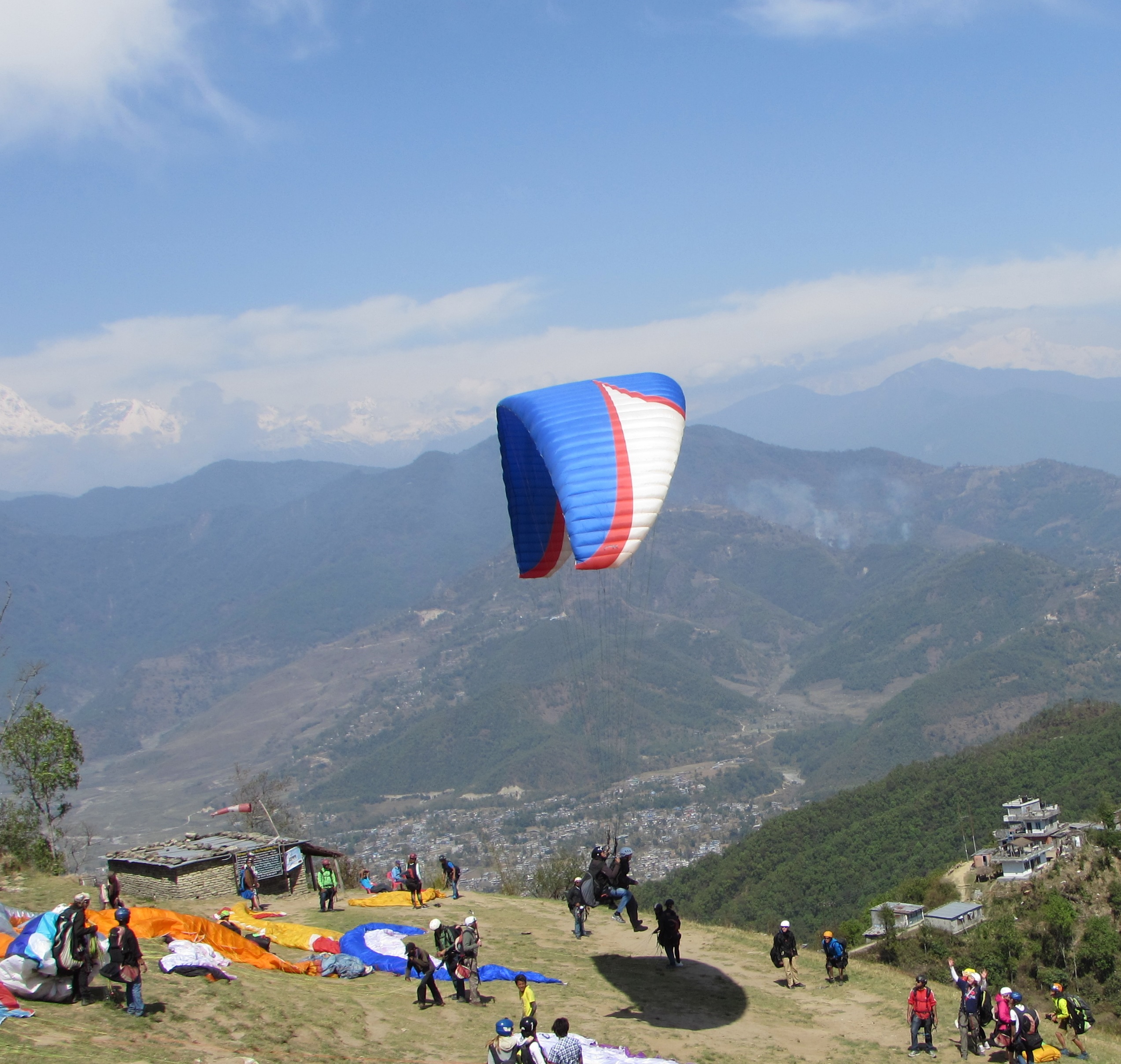 Finally we arrived in Sarangkot, where I was surprised to see the sky full of a kind of ballet of paragliders. Apparently tourists come from around the world to do their first paraglide here in tandem with a skilled pilot, just as they come to hike or trek in the Himalayas, or raft in the Nepal river rapids.