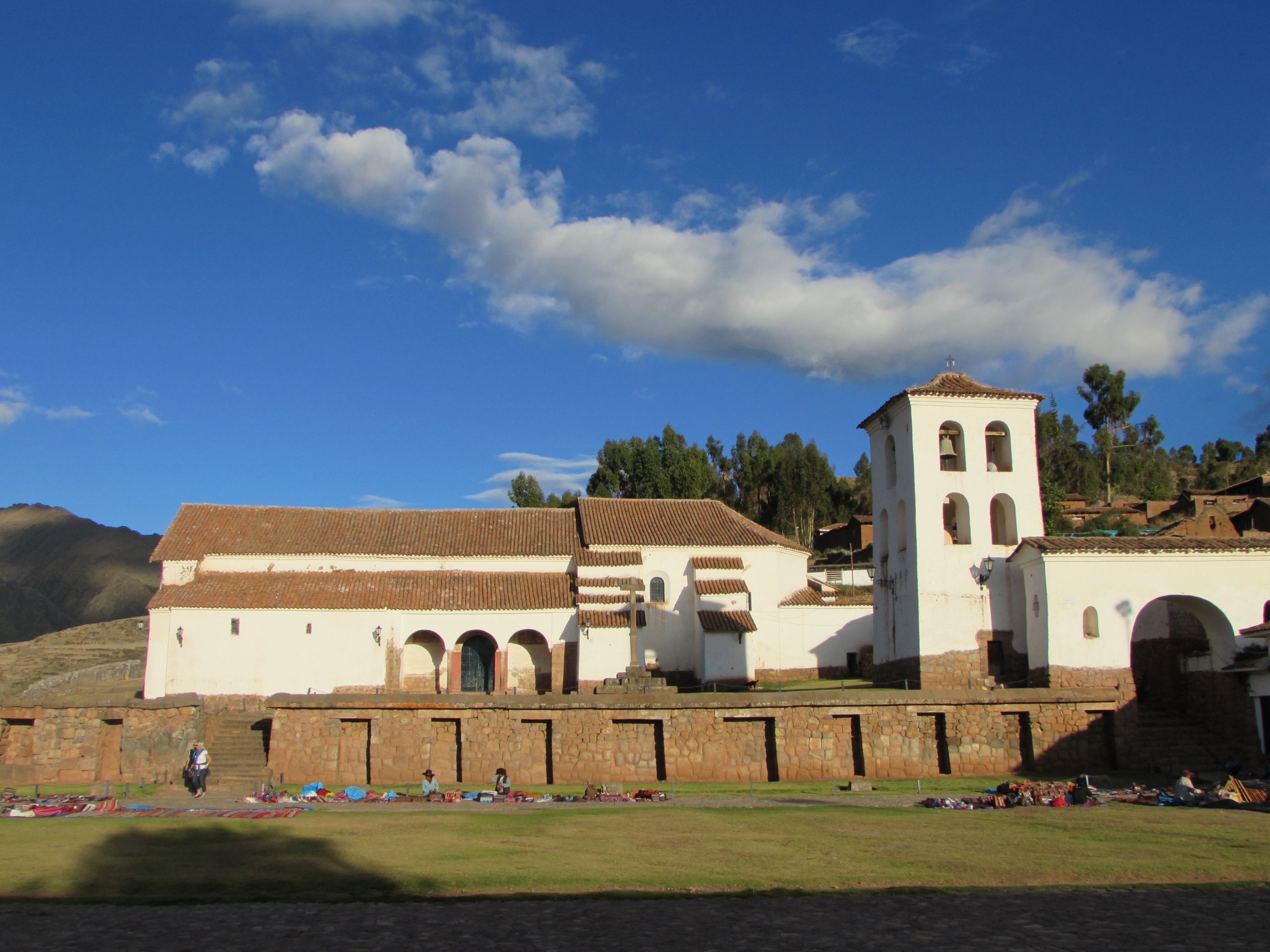 Chinchero, the height of religious places for Incas. In the niches in the wall around what was an Inca temple but was replaced with a Spanish church, were mummies of all the previous Inca rulers and high ranking people of the empire. During celebrations the mummies, decorated in gold, would be paraded and worshiped by the people followed by much chicha (corn beer) drinking. The Spanish burned the mummies in the 1500’s, and told the Incas to parade with statues of Catholic saints instead.