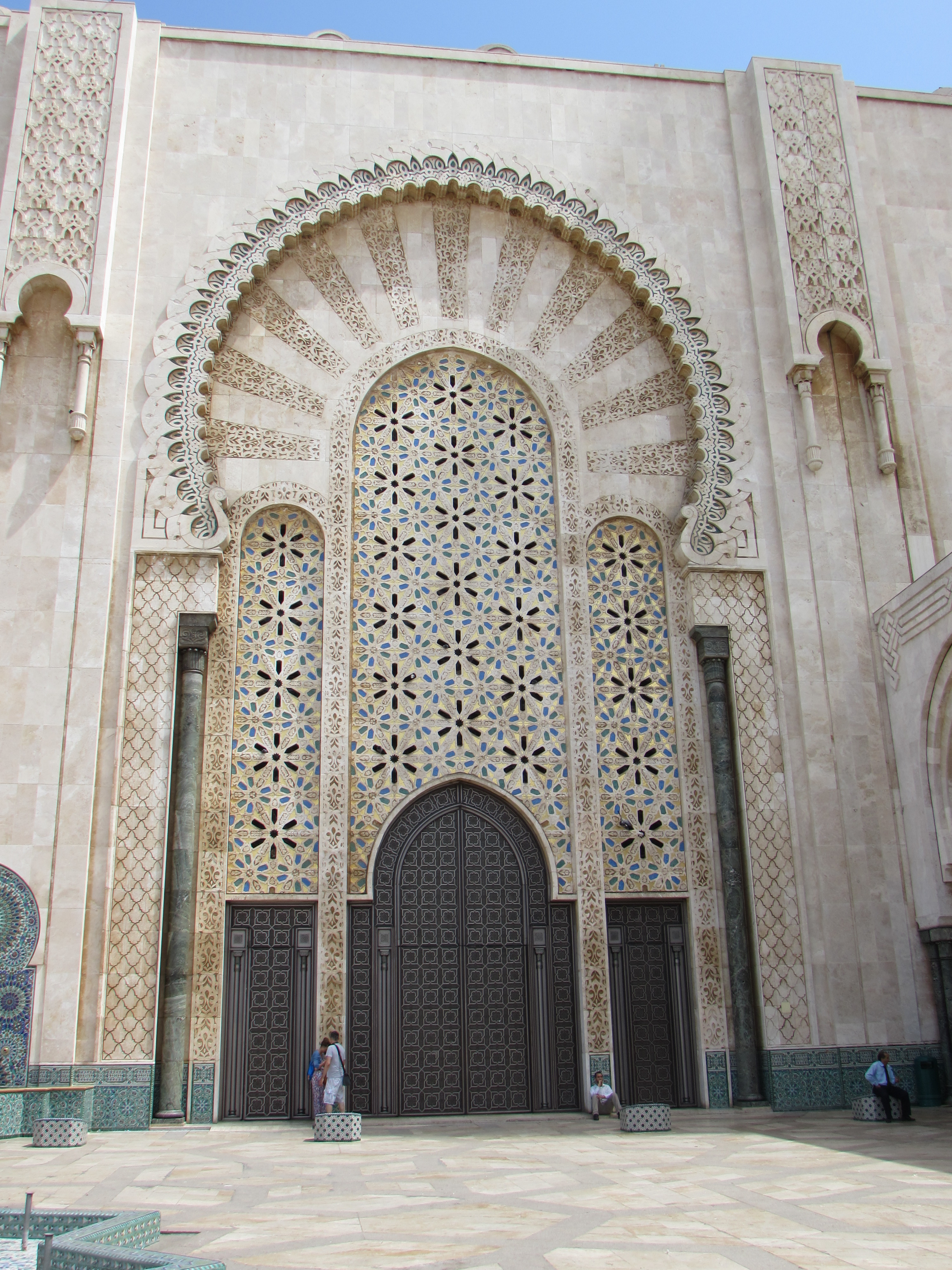 The first night we went to eat at a replica of Rick’s Cafe, from the Humphrey Bogart film called Casablanca. After dinner we met the owner who came up with the idea for the restaurant about 10 years ago. In the baccarat room the movie was playing continuously, while a jazz band played in the interior courtyard. Nice atmosphere, good food – and a nostalgic place for me, though not for Andrew who has not seen the film. The next day we visited the enormous mosque Hassan II, built with titanium to last forever.
