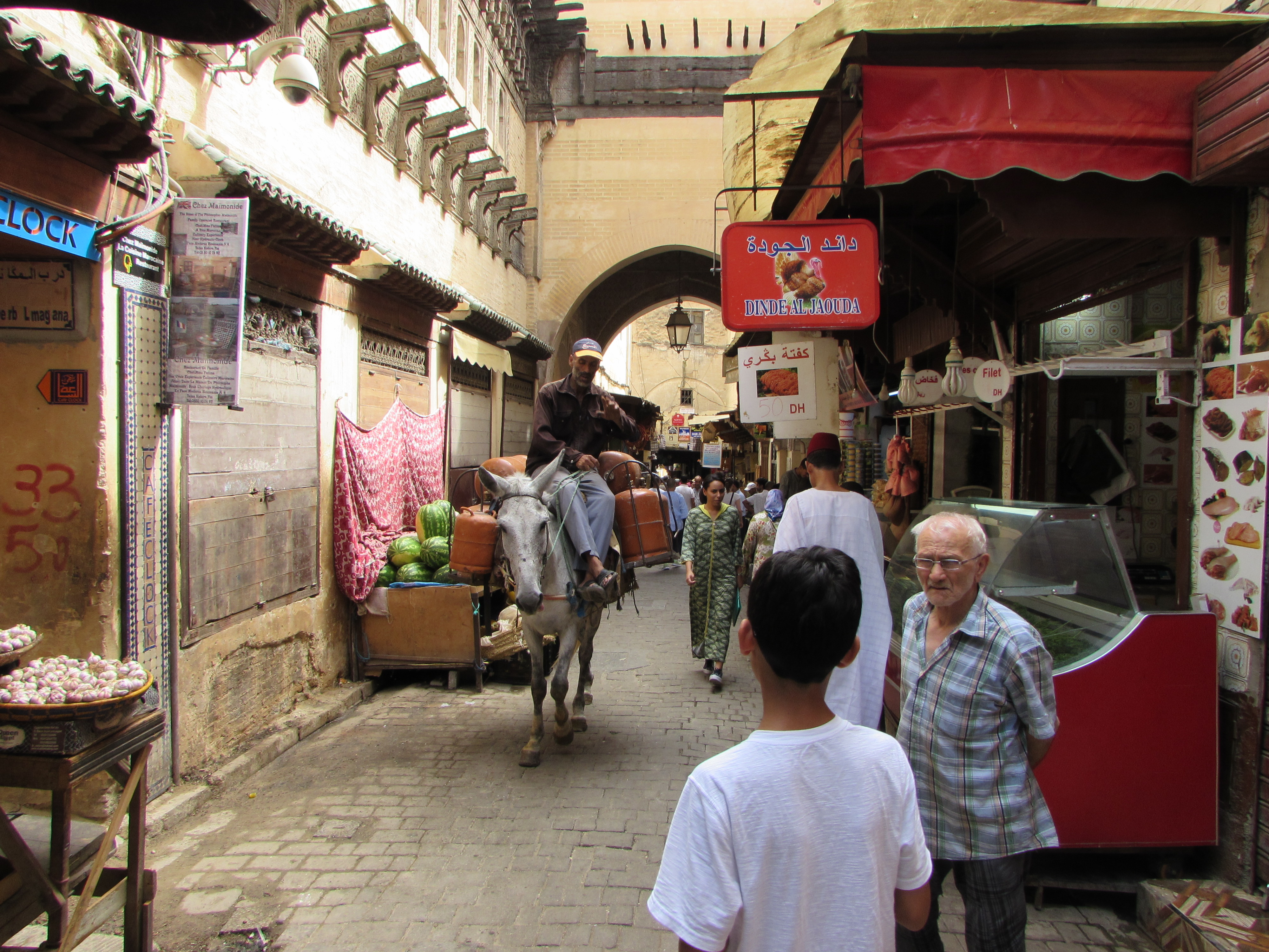 A four hour tollway drive got us to Fez, founded by the son of the founder of Morocco in 789. The old city center, the medina, has all the ancient flavor of a place that old, with interconnected maze-like walls of shops and souks and doorways. Behind the doors are simple homes or large mansions called riads.