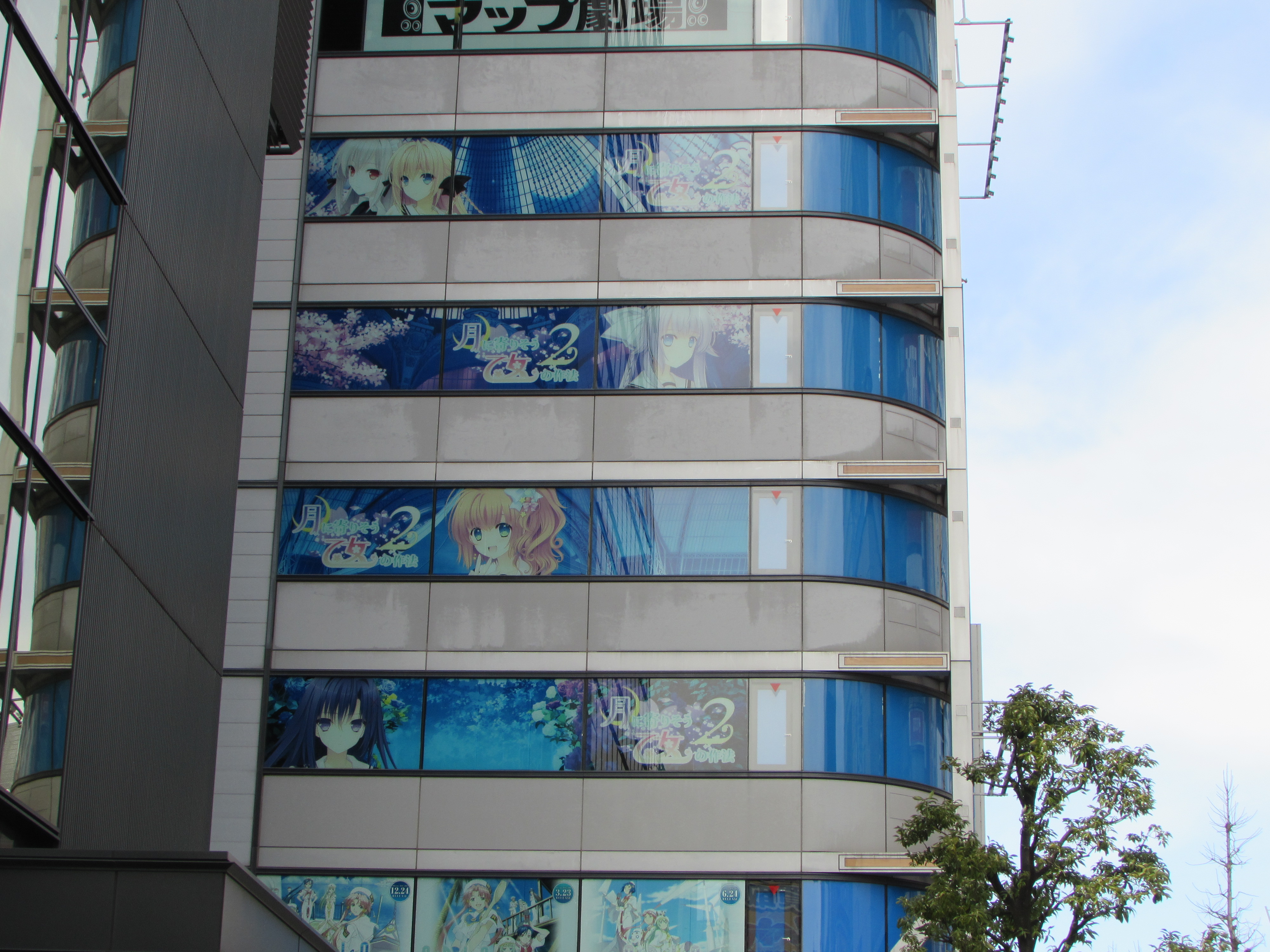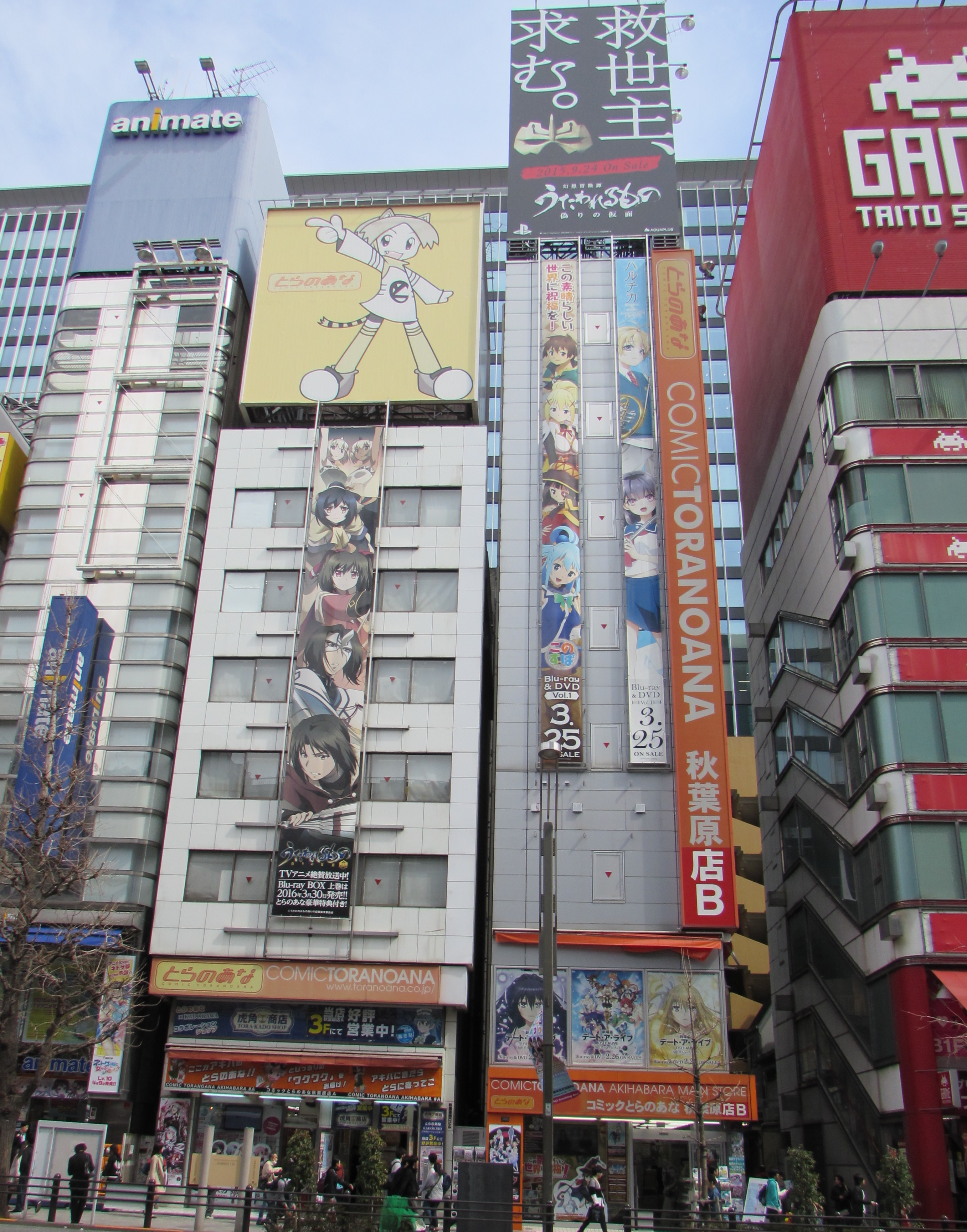 Entire buildings are covered in cartoon characters, and ads for upcoming anime movies.