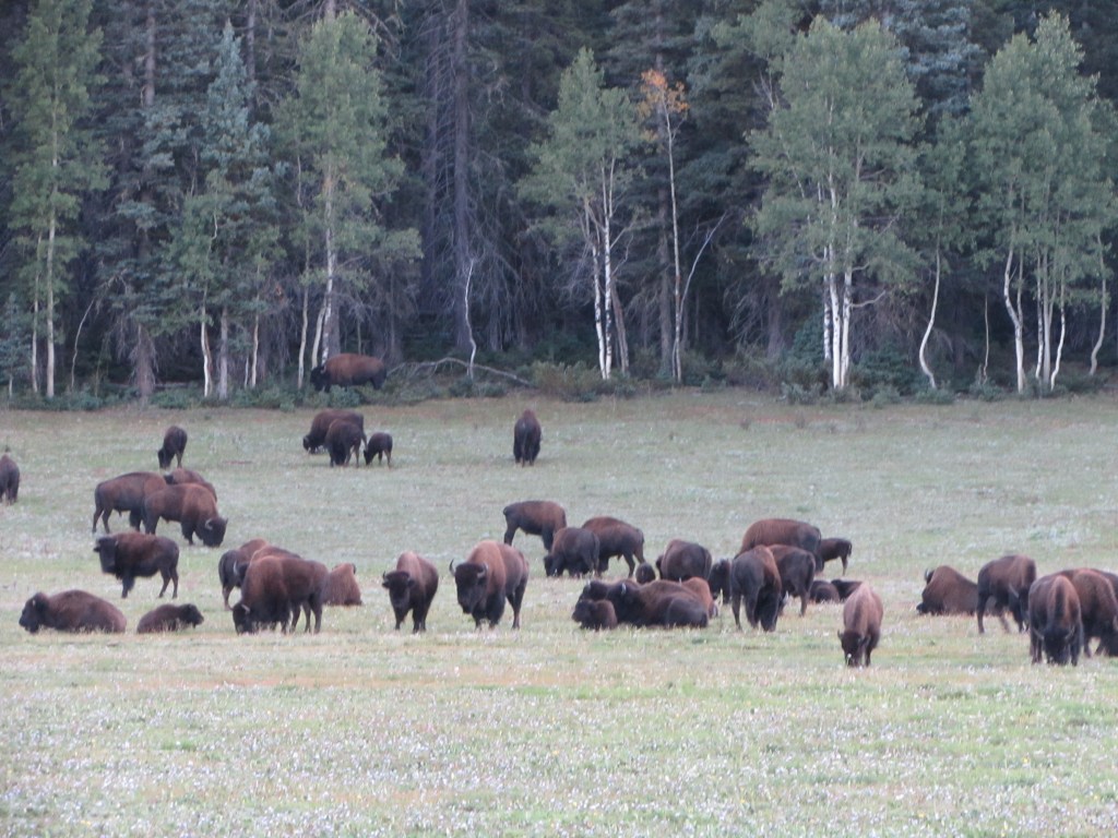 The last two hours of the good road to the North Rim are forest. In a green pasture not far from the lodge, we spotted a herd of buffalo. I quickly parked the car and got out with my camera, and noticed a familiar, earthy odor. The buffalo? Couldn’t be. They were too far from the road. Then I looked down. Fresh buffalo poop! Smells like goat poop only stronger.