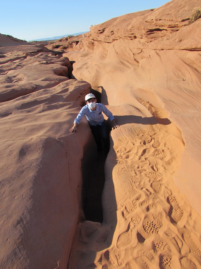 Our tour operator was Ken’s Tours, located on Indian land within walking distance to the slop canyon. About 12 of us were assigned a native guide named Jose. Informative and friendly, he told us the rules of the tour (masks on, no pictures while on stairs, etc). Then he led us down the gully to the entrance of Lower Antelope Canyon. An older Japanese woman looking a hot and tired and a bit scared, sat in the shade there, awaiting an atv ride back up as she had apparently been unable to complete (or even start) the tour. We continued past them to an opening where a series of narrow metal ladder-stairs led down. The last ladder-stair dropped steeply a good 30 feet to the bottom. I swayed a bit from vertigo, and tried not to look down. Facing forward, away from the steps, I progressed, concentrating on the next step. And the next. I held onto my camera with one hand and the guardrail with the other. finally I reached a sand floor and passed into a slightly larger opening where we gathered.